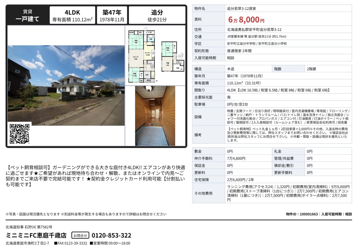ペット可☆社宅可(外国人入居相談可) エアコン付き 広い庭 駐車2台 物置 諸条件お気軽にご相談ください 設置の空気清浄機は24時間稼働させること(24時間換気)アクセス24月額1320円 室内清掃料99000円(税込) ストーブ清掃料(1台につき)27500円(税込)エアコン清掃料(1台につき)27500円(税込)ボイラー点検料27500円(税込) |